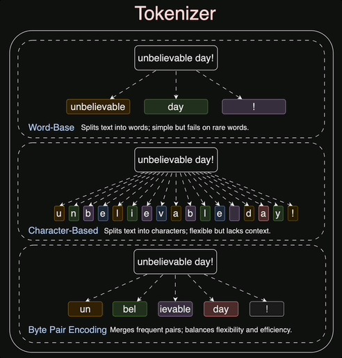 - Character/Byte-level: Vocabulary is small (256), but sequences become incredibly long, making attention computationally expensive (quadratic cost).